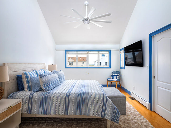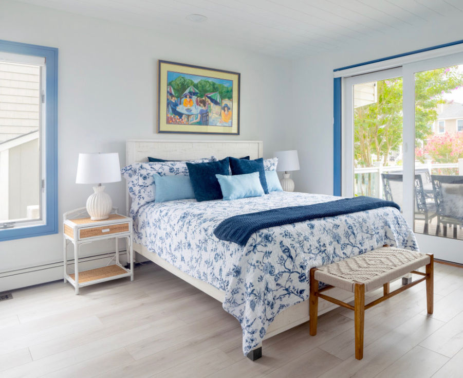 Designed for relaxed waterfront living, this home blends classic coastal elements with clean, modern details. A crisp blue-and-white color palette flows throughout, complemented by warm wood tones and textured accents for depth and balance. The kitchen features bold blue cabinetry and timeless finishes, creating a functional yet inviting gathering space. Open living and dining areas feel bright and connected, while the bedrooms offer calm, airy retreats layered with soft textiles and natural light.